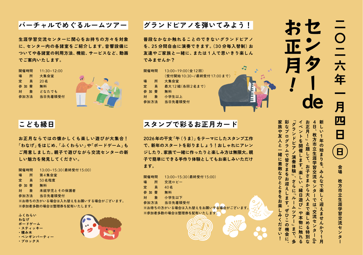 新しい1年の始まりを、みんなで楽しく迎えませんか?1月4日、枚方市立生涯学習交流センターでは「交流センターdeお正月!」と題して、お子さまから大人まで楽しめる特別なイベントを開催します。楽しい「縁日遊び」や本物に触れる「グランドピアノ演奏体験」、多彩なプログラムで皆さまをお迎えします。ぜひこの機会に、家族や友人と一緒に素敵なひとときをお楽しみください!