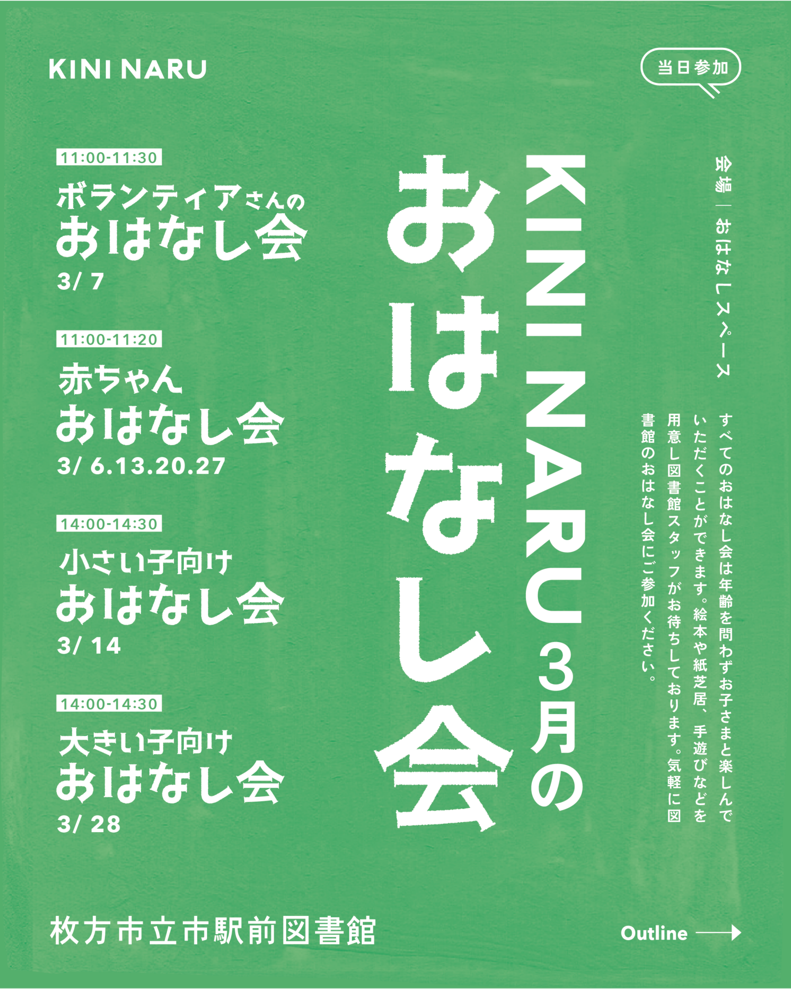 枚方市立市駅前図書館では定期的におはなし会を行っております。絵本や紙芝居、手遊びなどを用意してお待ちしております。気軽にご参加ください。
