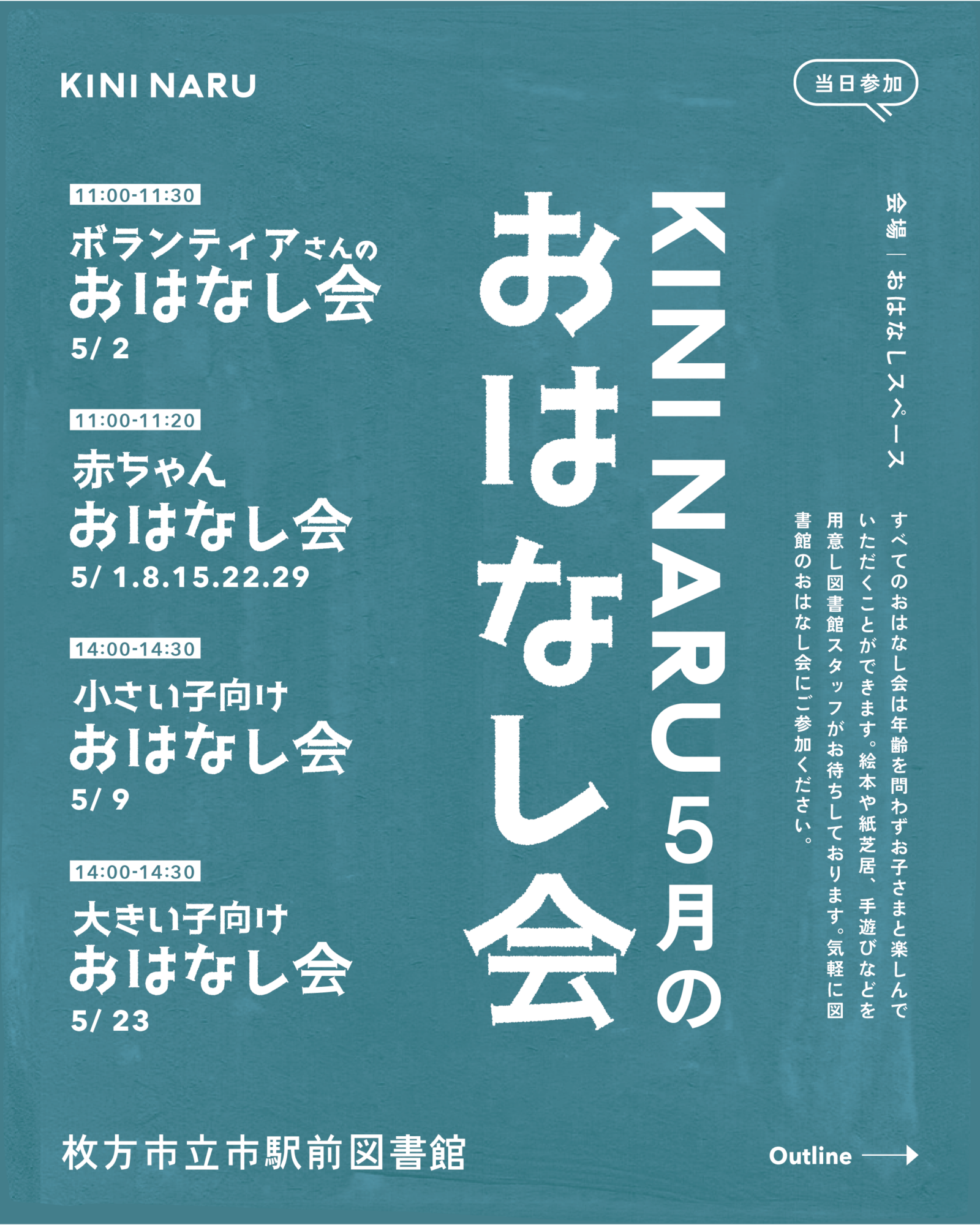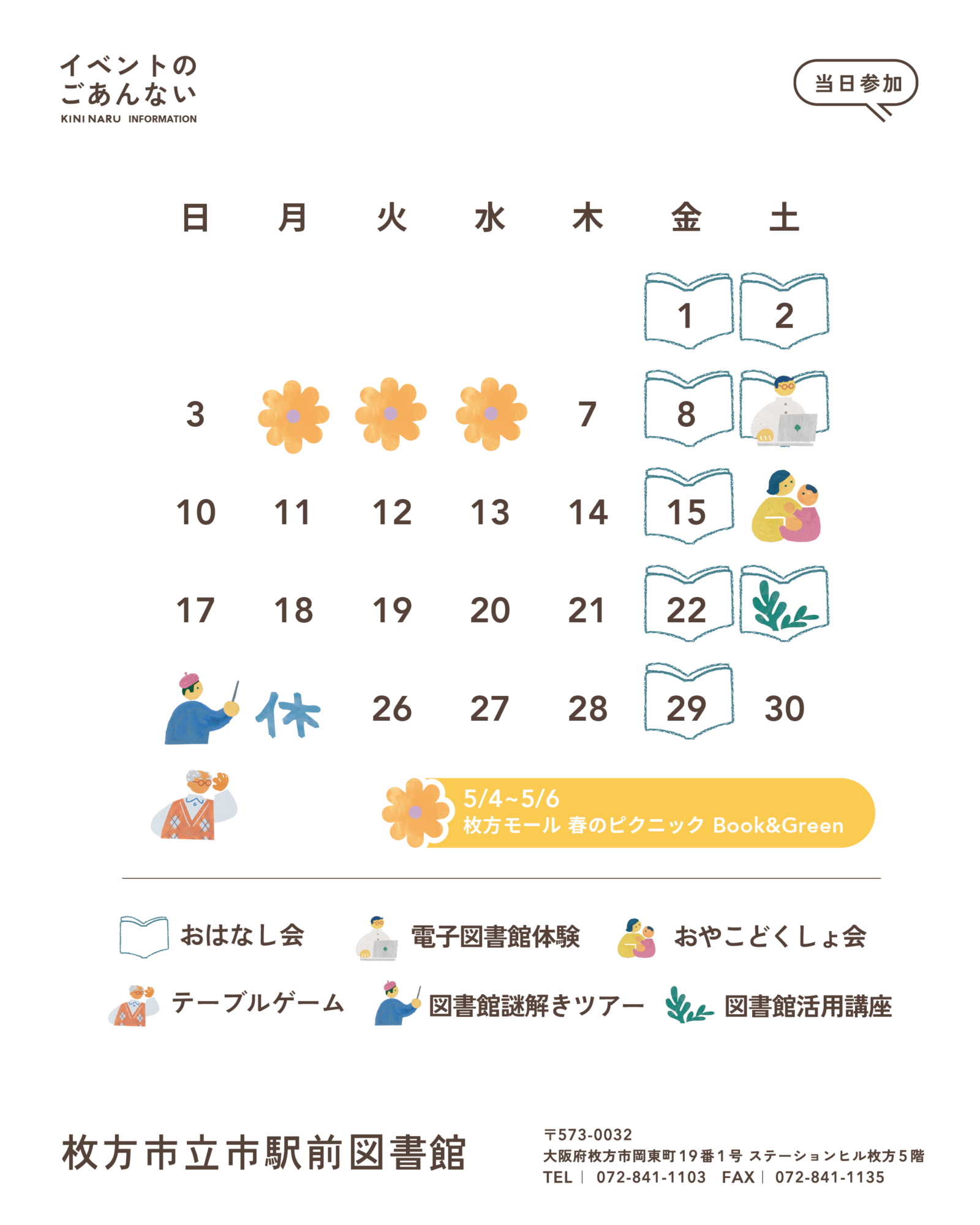 枚方市立市駅前図書館では定期的におはなし会を行っております。絵本や紙芝居、手遊びなどを用意してお待ちしております。気軽にご参加ください。
